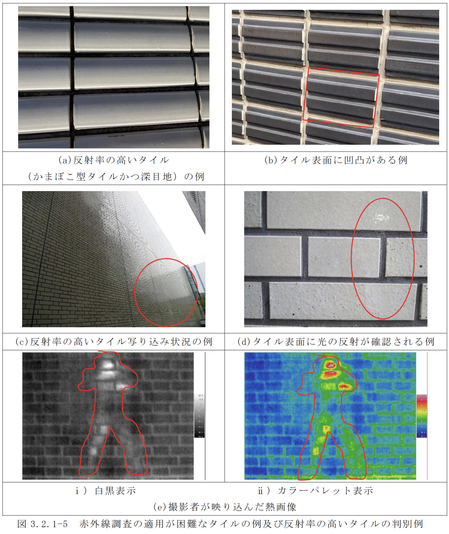 下地材の種類などの条件によっては、赤外線調査が技術的に困難と考えられる場合や、十分な技術的情報が得られない場合もあるので注意が必要である。これらに関する注意事項は、「3.2 赤外線調査の適用条件の把握」をあわせて参照すると良い。