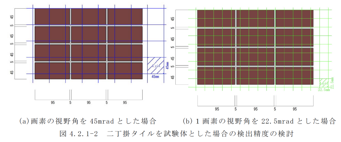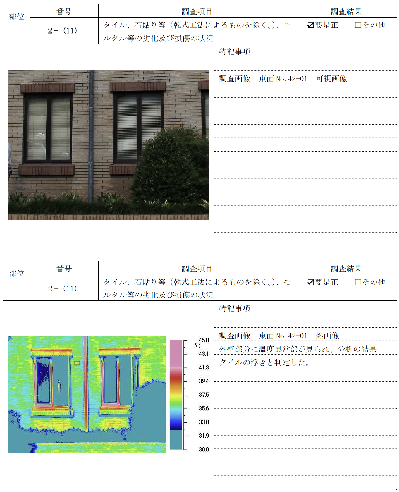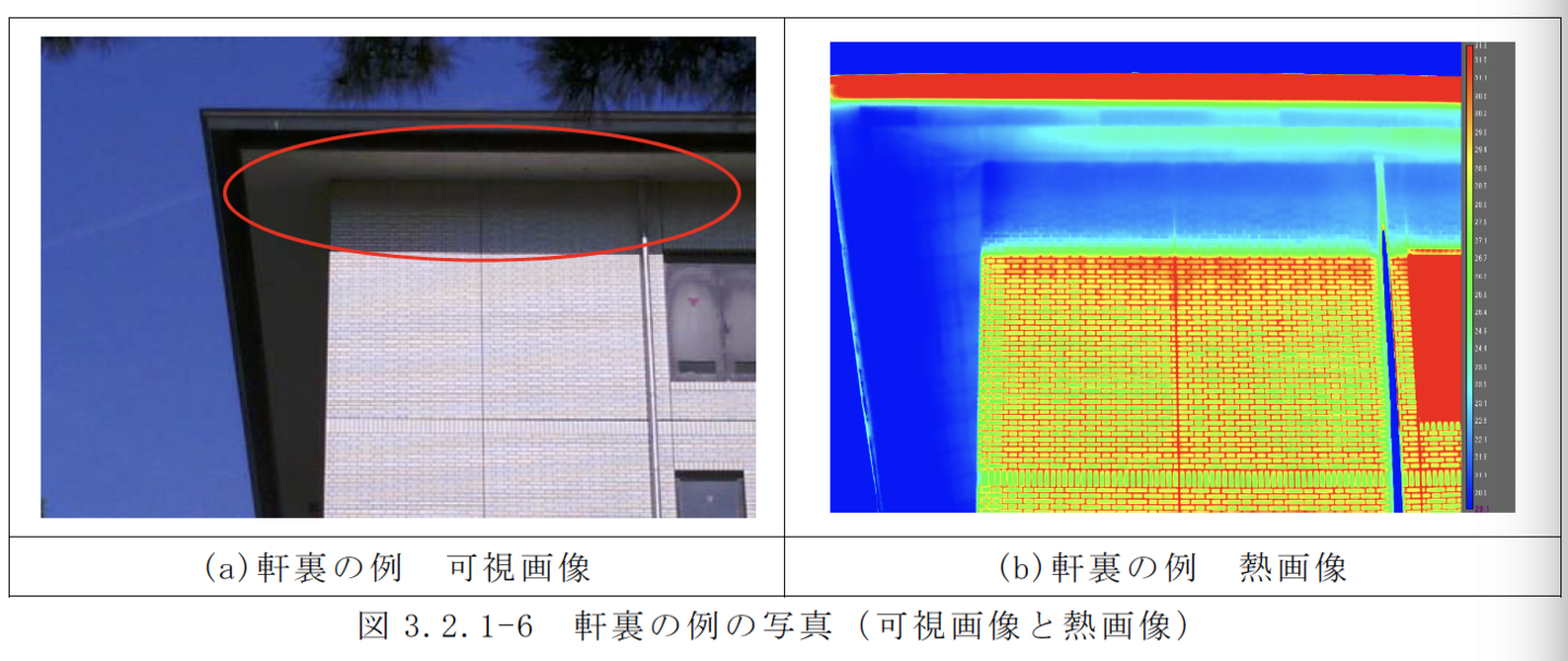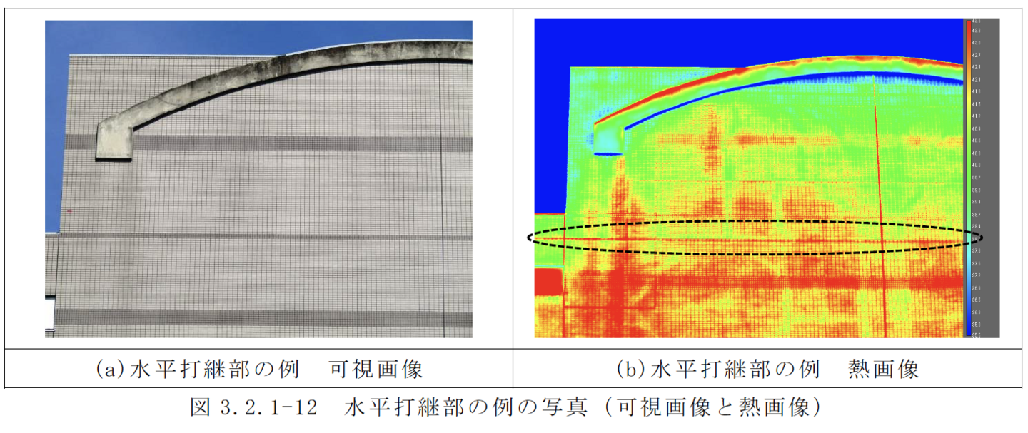 赤外線装置により撮影されたタイル貼り等の被写体表面の熱画像で確認できる表面温度差によって、建築物外壁のタイル等の浮きの有無や程度を調査する方法。打診と同等以上の精度であることが確認された方法に限る。