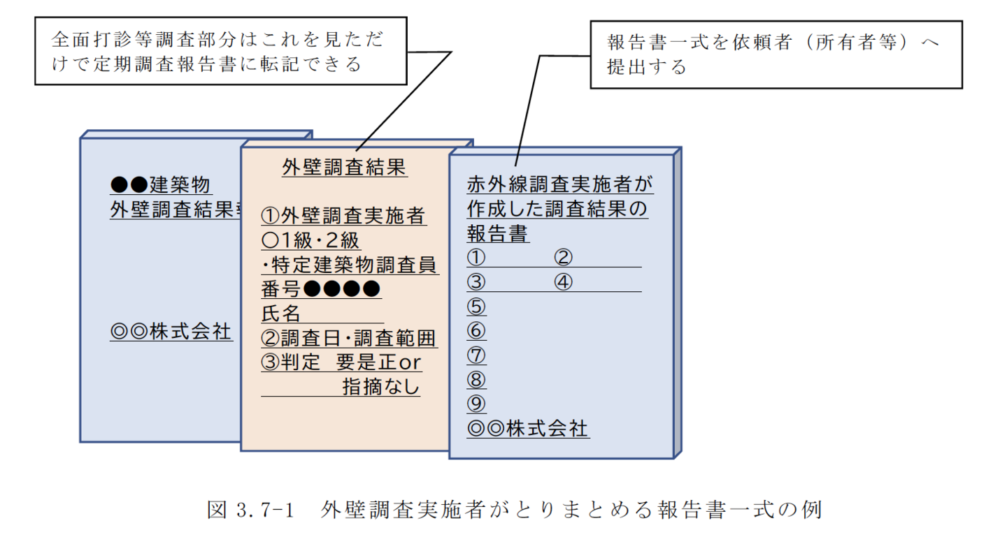 外壁調査実施者は、図4.7-2 に示すとおり外壁調査結果報告書及び赤外線調査実施者とドローン調査安全管理者が作成した調査結果の報告書を組み合わせて建築物所有者等へ提出する。