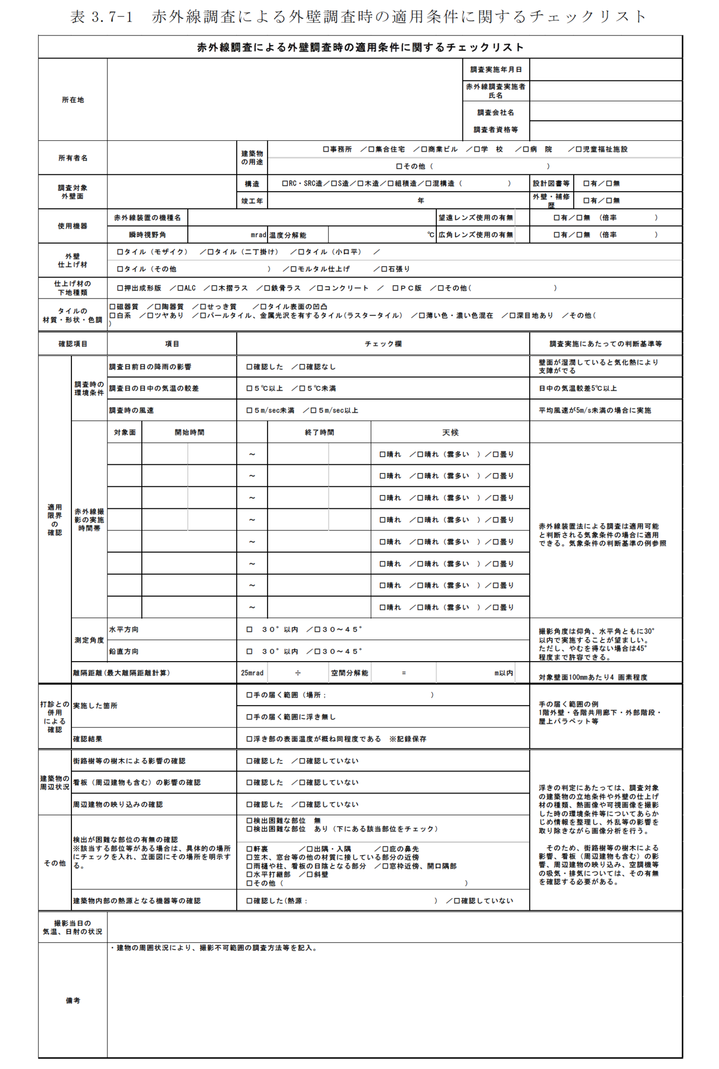 報告書には単に結果図だけではなく、【4.2.1 ドローンによる赤外線調査の適用条件】及び【3.2 赤外線調査の適用条件の把握】の下で適切に撮影されたことが後から確認できるようにしておく必要がある。【3.3 事前調査】で作成した「事前調査チェックリスト」を基に「赤外線調査による外壁調査時の適用条件に関するチェックリスト」(表3.7-1 参照)を作成し、さらに【4.5 調査の実施(打診との併用による確認を含む)】で得た調査日等における適用限界の確認等の項目を記入し報告書に添付する。